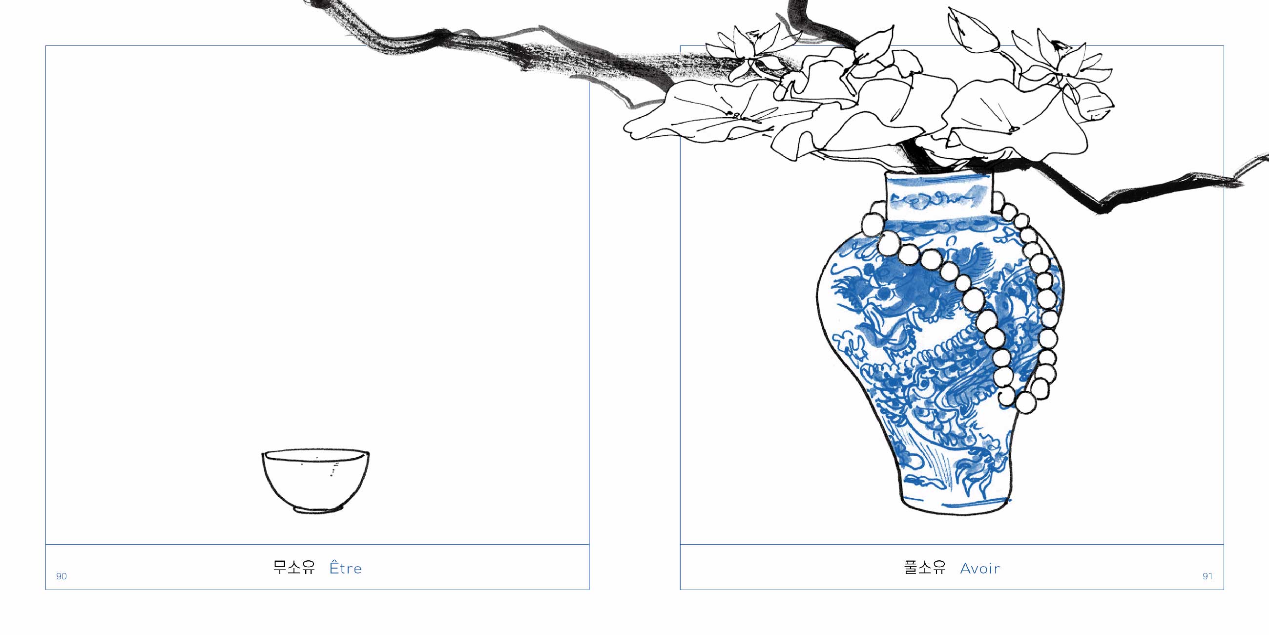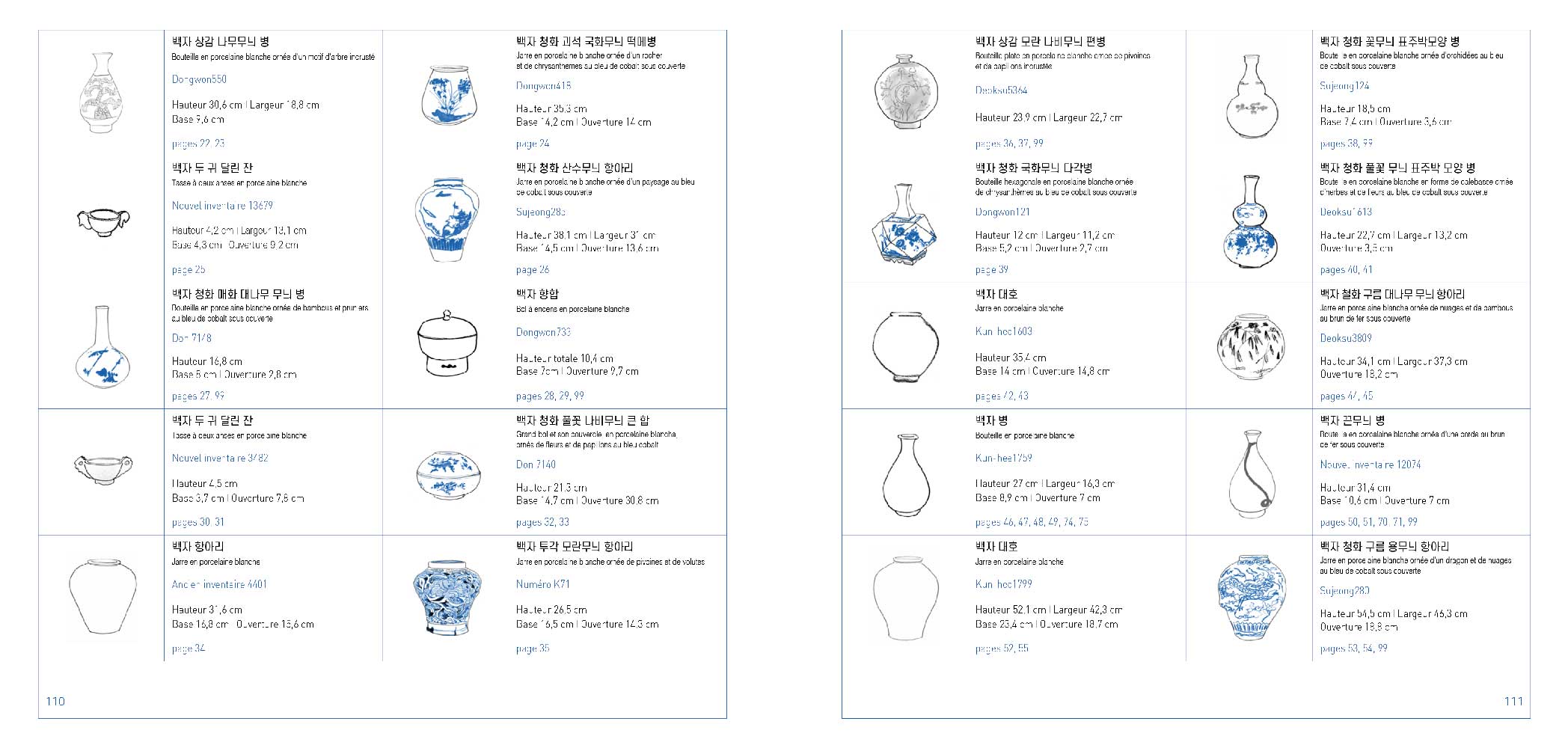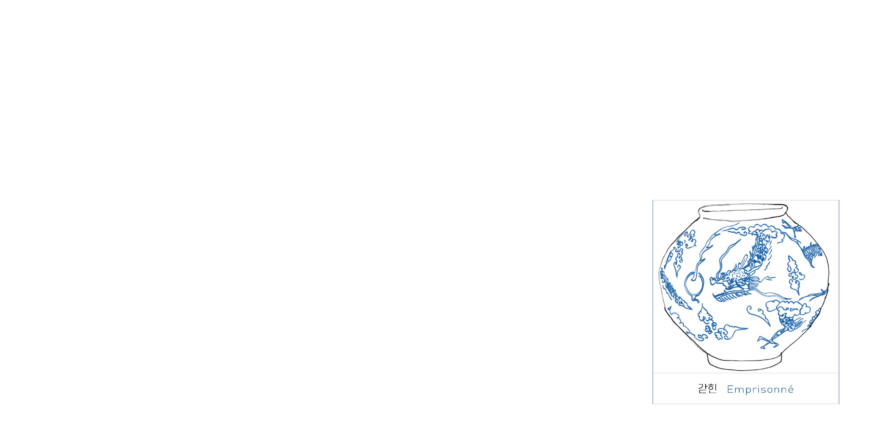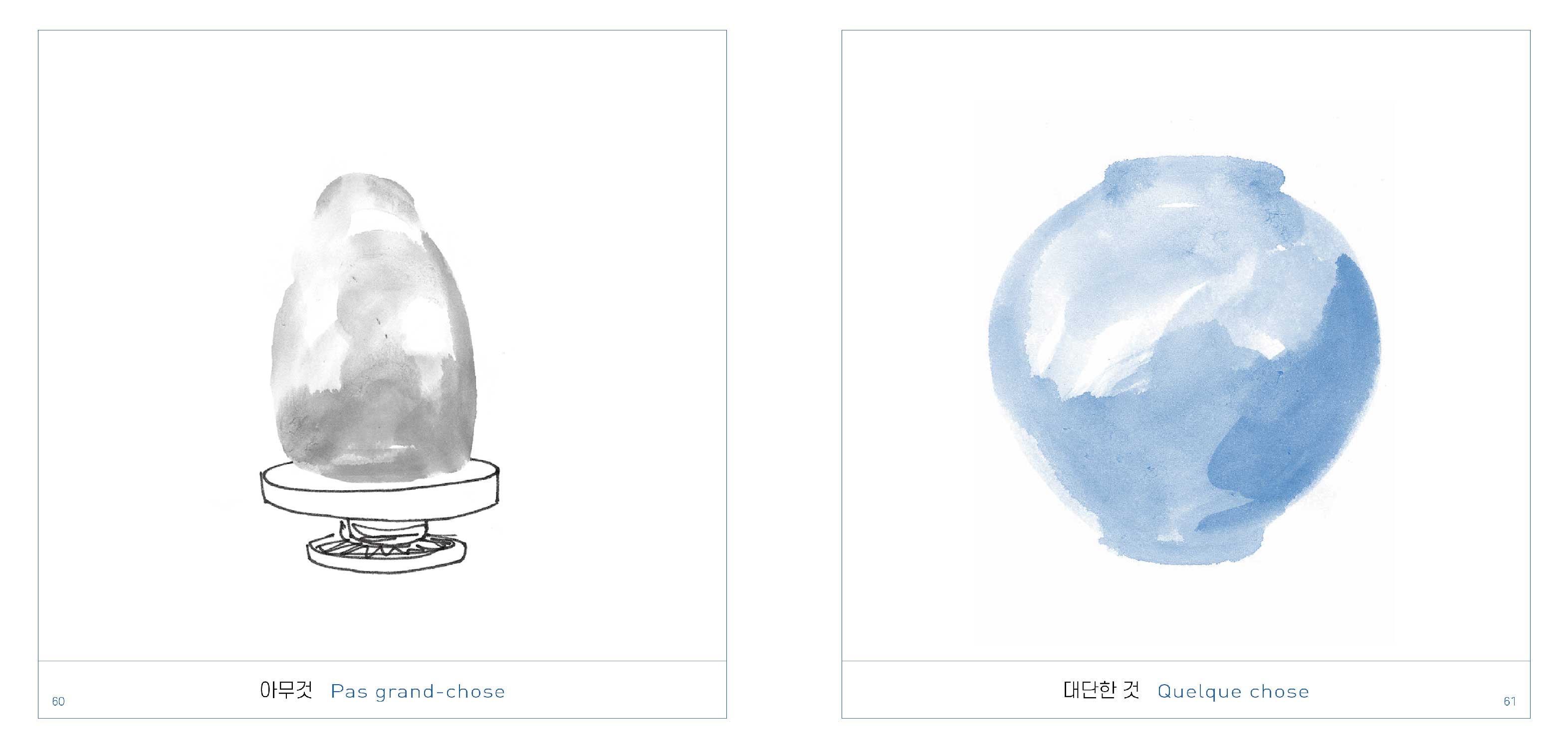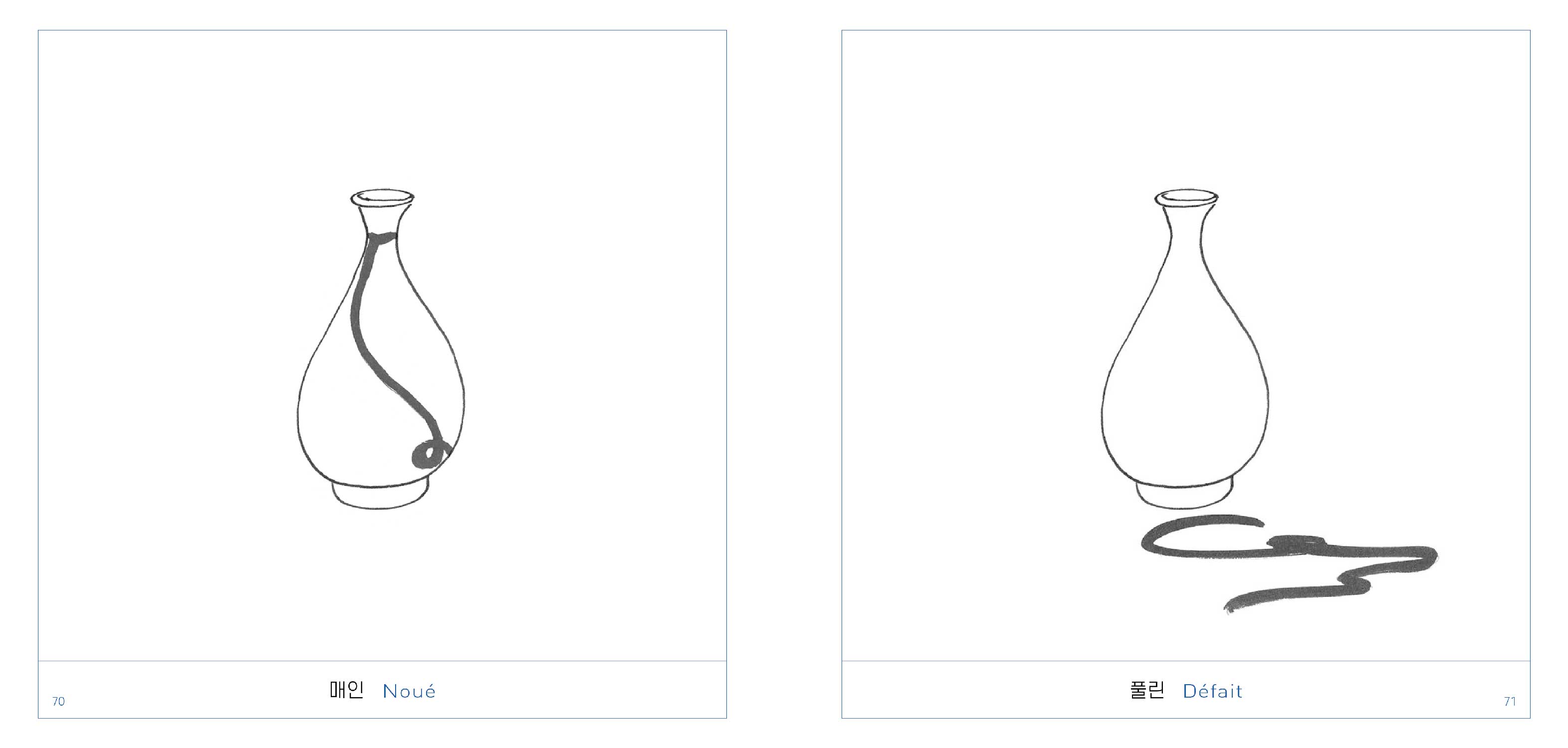 Chaque double-page est réjouissante, étonnante et tellement raffinée dans son dessin comme dans sa mise en page. Sous chaque porcelaine, toutes issues de la période Joseon (1392-1910), juste un mot, que nous avons choisi de faire apparaître aussi en coréen, langue si graphique… Et en fin d'ouvrage, chaque porcelaine est élégamment répertoriée, avec son visuel en miniature, sa taille et son descriptif, comme au musée.