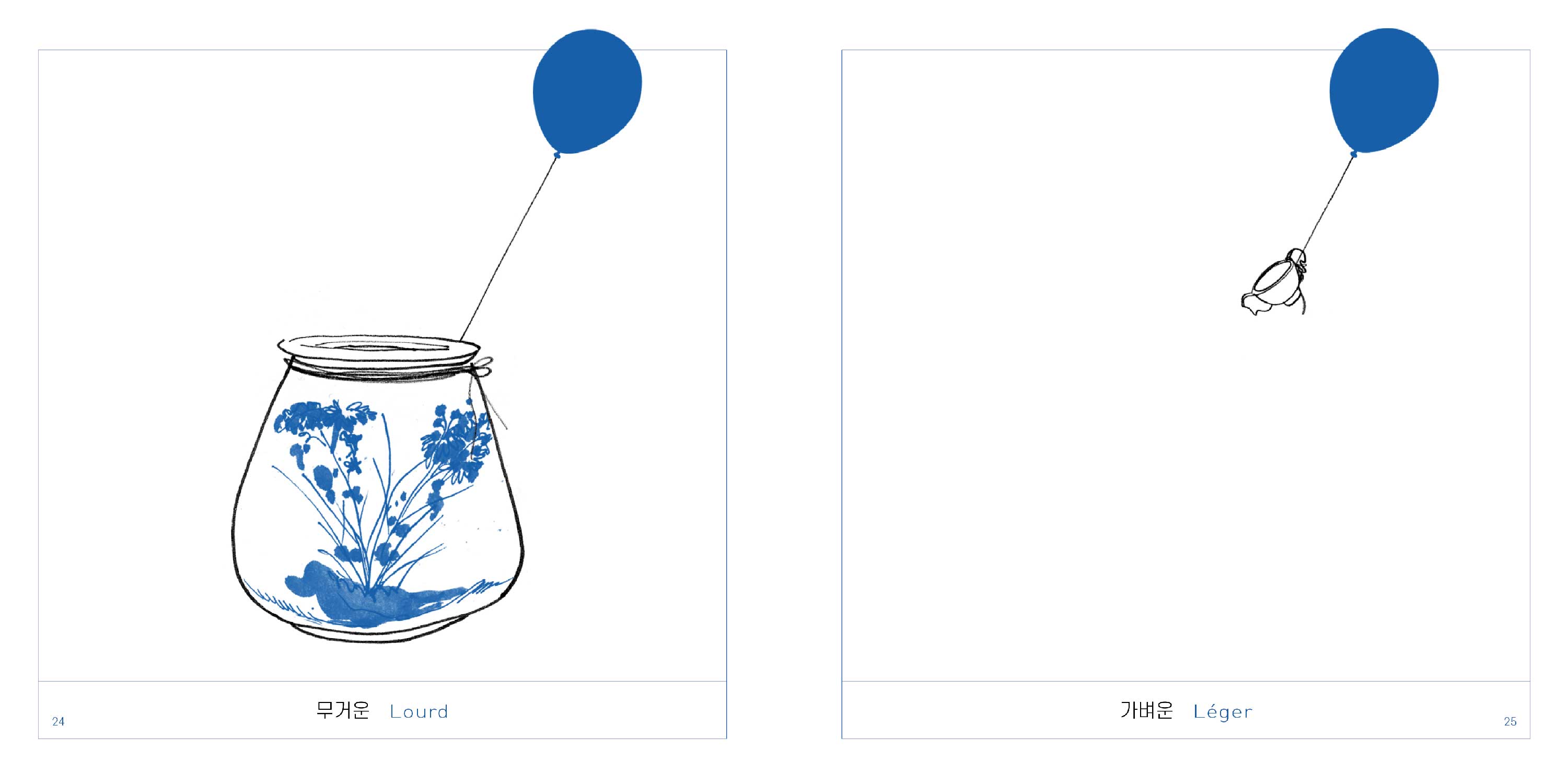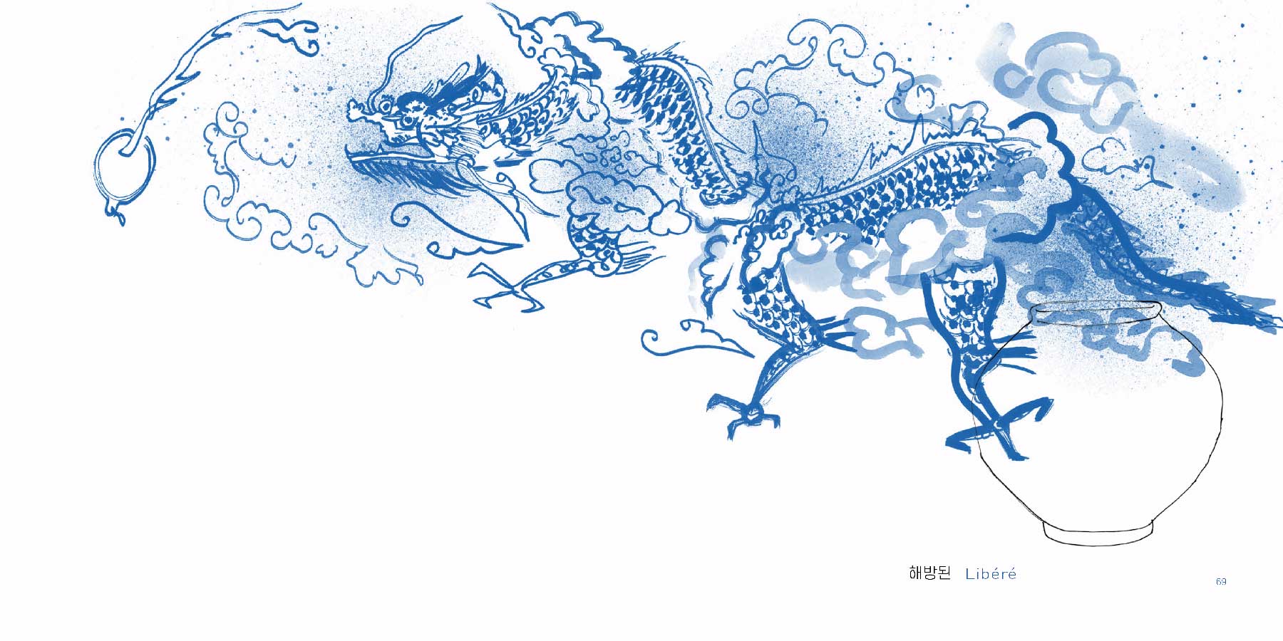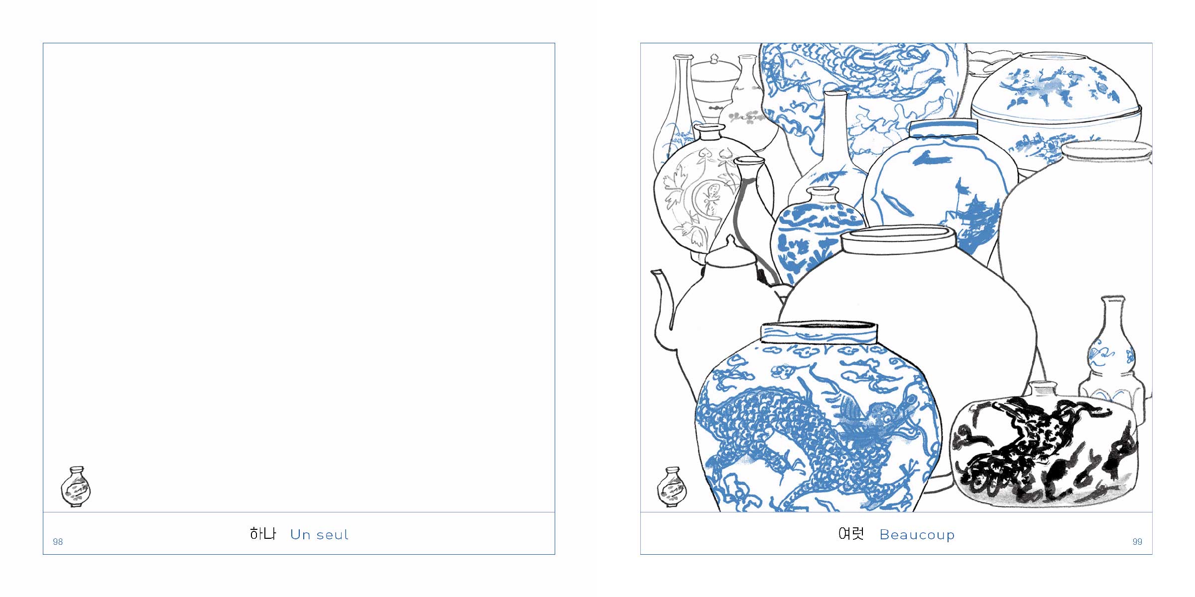 L'illustratrice coréenne Suzy Lee, lauréate du prestigieux Prix international Andersen, signe un nouvel album pour petits curieux mais aussi pour grands amateurs d'art… et de culture coréenne. Elle a puisé dans les réserves du Musée National de Séoul, une centaine de jarres, pots, vases ou coupes en porcelaine, toutes blanches et bleues, qu'elle a dessinées et ingénieusement regroupées par deux ; deux images qui s'opposent, se répondent, tout en blanc, noir et bleu.