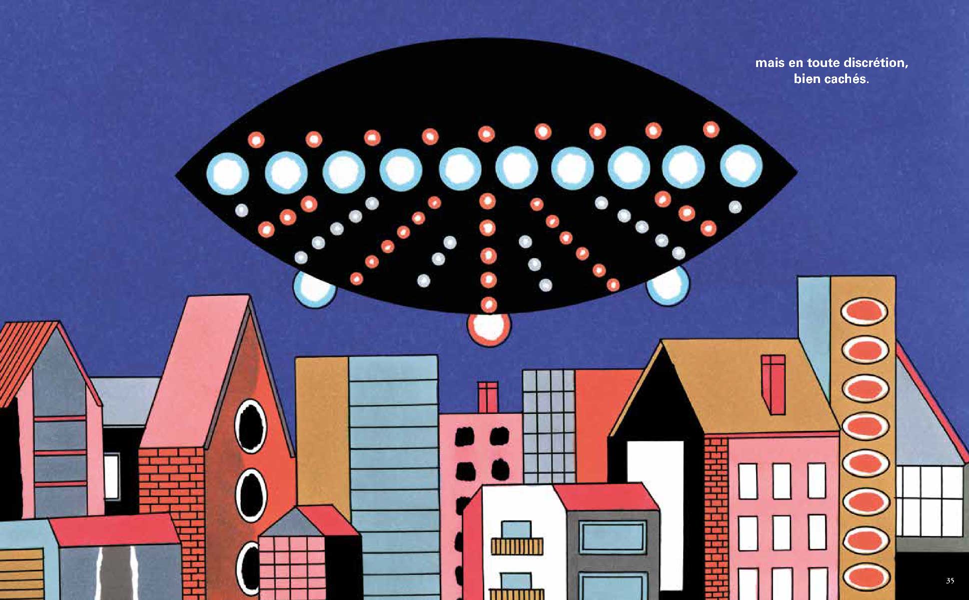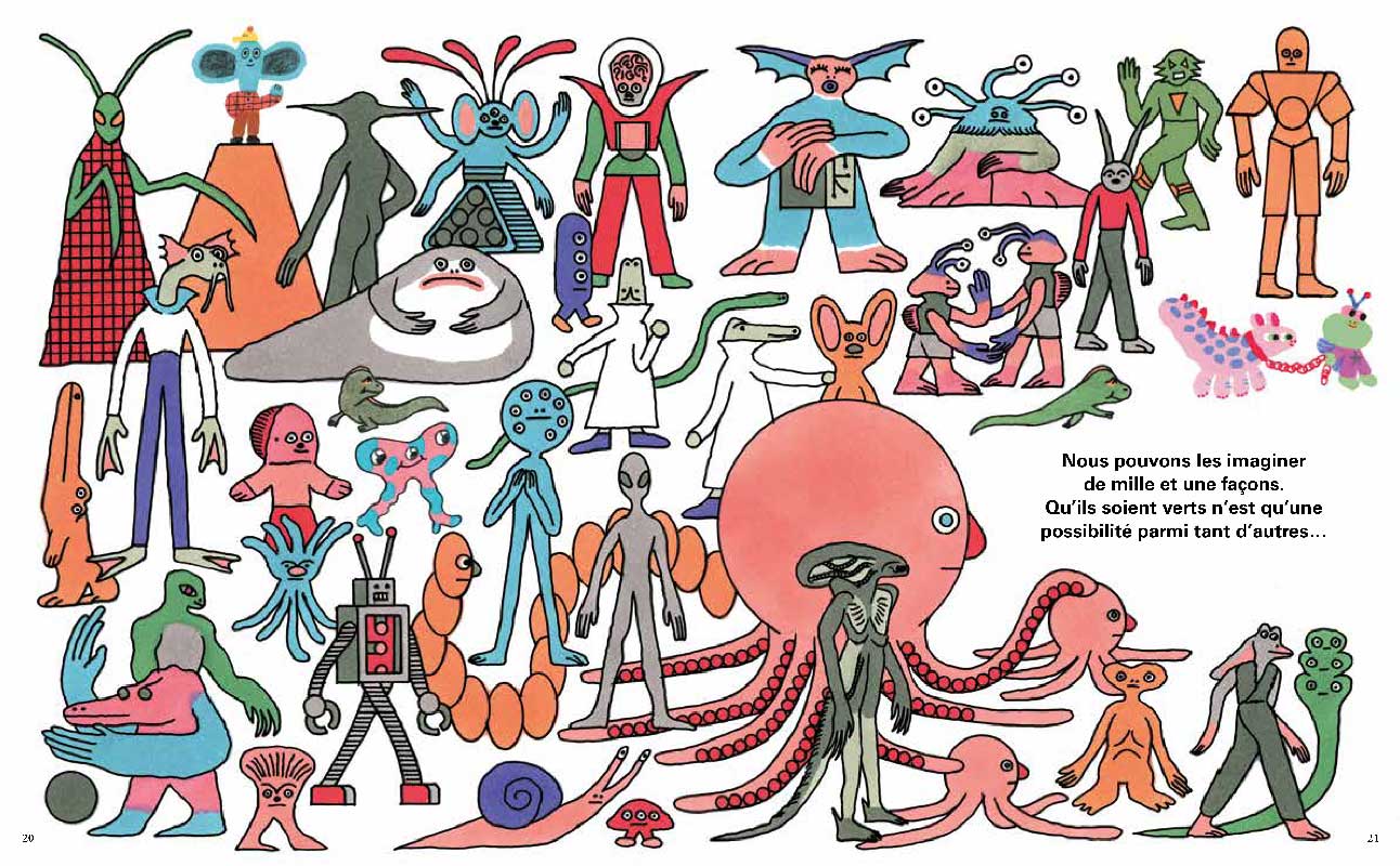 Après avoir clairement précisé que nous n'avons jamais eu de preuve de l'existence d'extraterrestre, l'auteur libère sa créativité débordante, dans une belle ambiance graphique très science-fiction / années 1950, imaginant d'invraisemblables créatures… Ces supposés extraterrestres ont-ils des formes molles, des cornes au bout des ailes ? « À moins qu'ils aient juste la tête de ton voisin ?!! » Et le livre se conclut, comme le précédent dans la collection « C'est vrai ou c'est faux ? », La Terre n'est pas plate, par des précisions sur un état simple de nos connaissances à propos de la vie dans l'univers. En 2026, les enfants vont peut-être avoir envie de se référer à de vraies informations scientifiques… ou en tout cas de dessiner les extraterrestres qui habitent leur imagination !